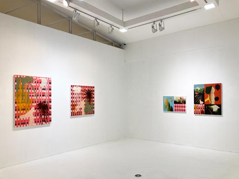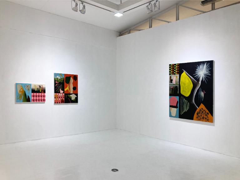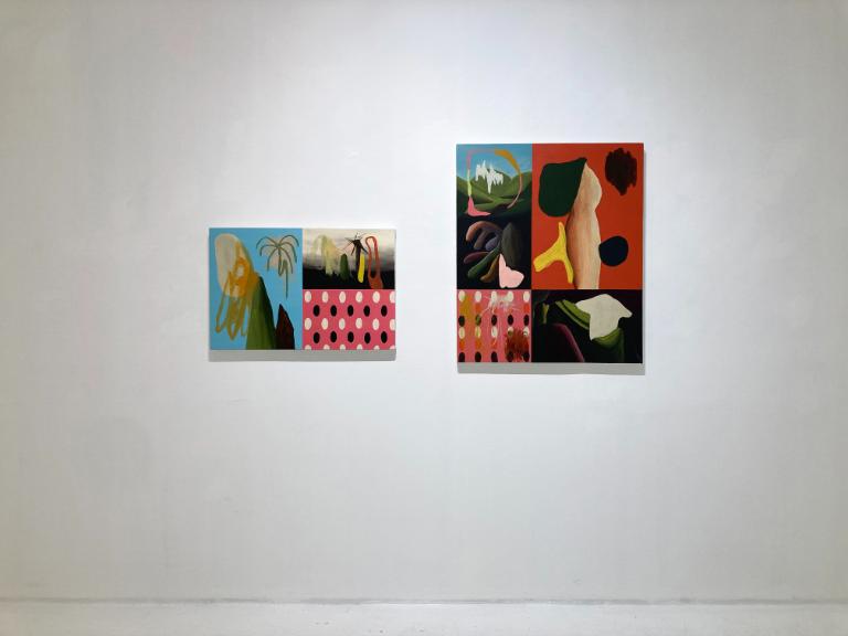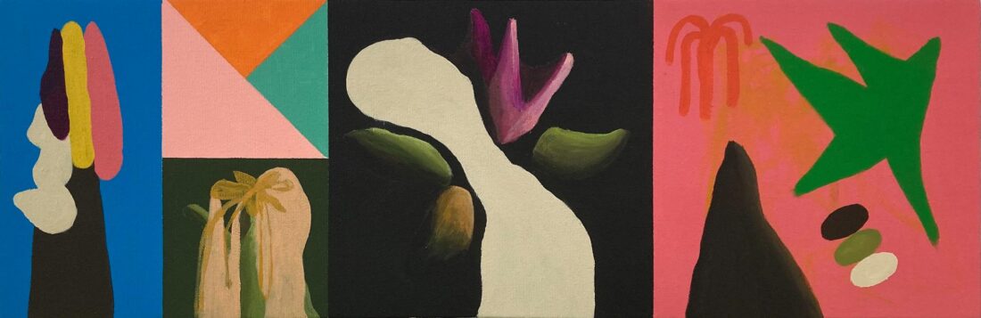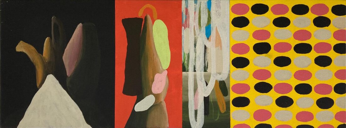 The series begins with Troposphere 1 and Troposphere 2, where color, form, and feeling hover in an atmospheric zone between tension and release. The troposphere becomes the site of breath, the narrow range within which perception remains clear before total immersion in the spin. In Sweet Surrender, divided into four panels, the composition splits time and space into varying sequences. With the surface divided into unequal folds of four, the viewer perceives them not as narrative but as simultaneous visual events.