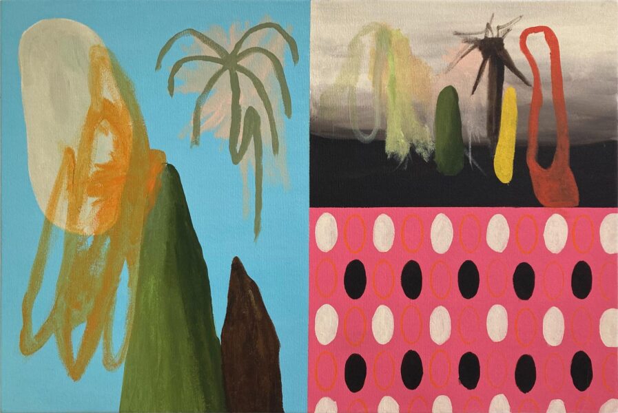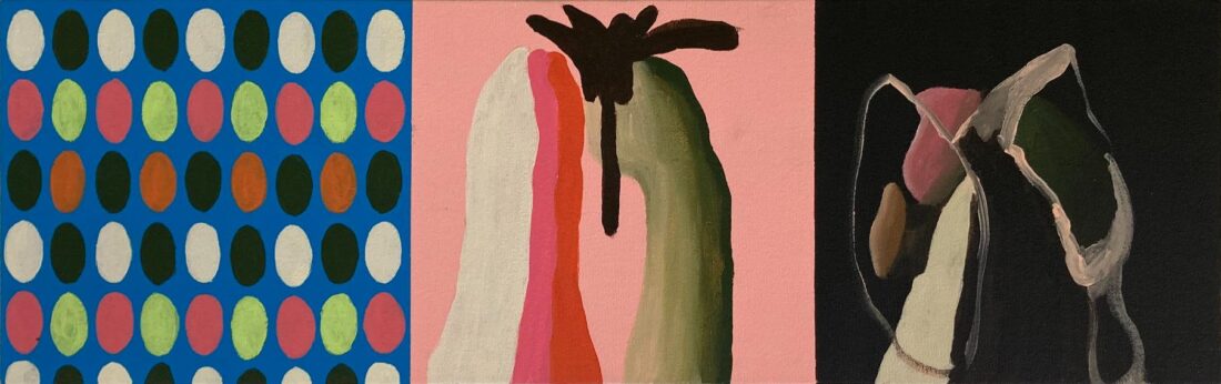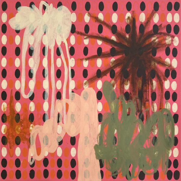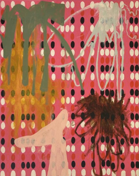 In Acceptance is a Brutal Bliss 2, Baladjay transforms accident into order. The surface began as a field of repeated dots. Then, a spill of paint altered its surface. Rather than erasing the happy accident, the artist allowed the intrusion to remain, integrating the rupture into the final structure and even adding a few more interventions to the plane. The result is a painting that records its own becoming, accepting the inevitability of error as part of the work’s syntax.