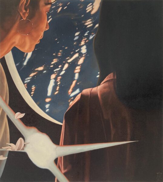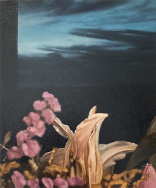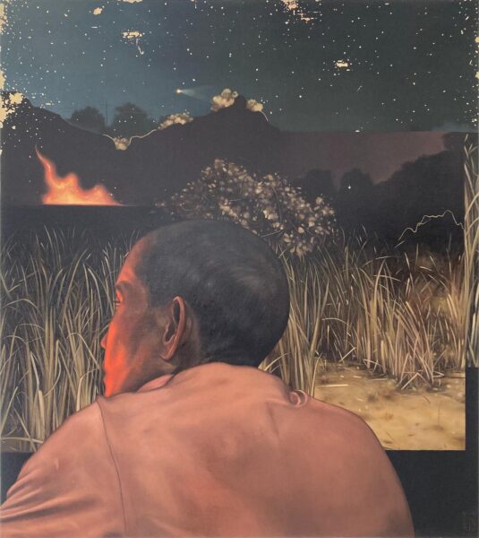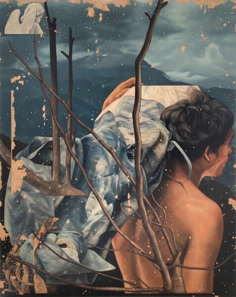 Thoughts form and shift as they emerge, given life and meaning, illustrating the quiet persistence of growth under observation. In Embers from the Burning Wings of Icarus, a bright streak cuts through the sky. Below, two figures watch what descends, its brief glow reminding them of a shooting star, not a sign of disaster. This moment exists between spectacle and detachment, like fireworks: what can be troubling in reality can look beautiful from afar—its light show fascinating eye candy, but emotionally devastating. Within Family Tree II, a solitary figure carries broken branches. These symbolize fragments of family, memory, and responsibility. Endurance is treated gently with no theatrics like Sisyphus; it simply reflects the human experience.