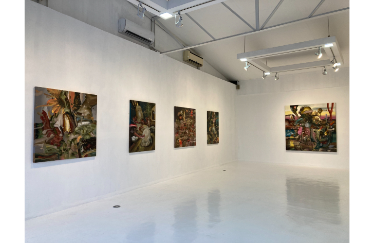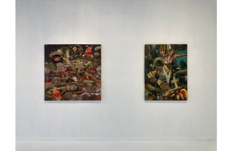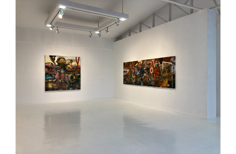 Espino’s paintings surge with ribbons and commotions of paint: upheavals, ascents, and transformations captured in their restless motion. These gestures, coiling upward, resolve into bodies marked by strength and vigor, as though energy itself were breaking free from flesh. Amid these unfurling forces emerge the signs of civilization—crosses, thresholds, whorls of attention—suggesting portals into another order of meaning.